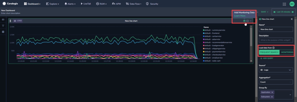 Coralogix supports adding monitoring data (formerly known as archive data) to your custom dashboard widgets. This enables you to see data from the Monitoring (medium priority) tier in your custom dashboards in addition to the regular Frequent Search (high priority) data.